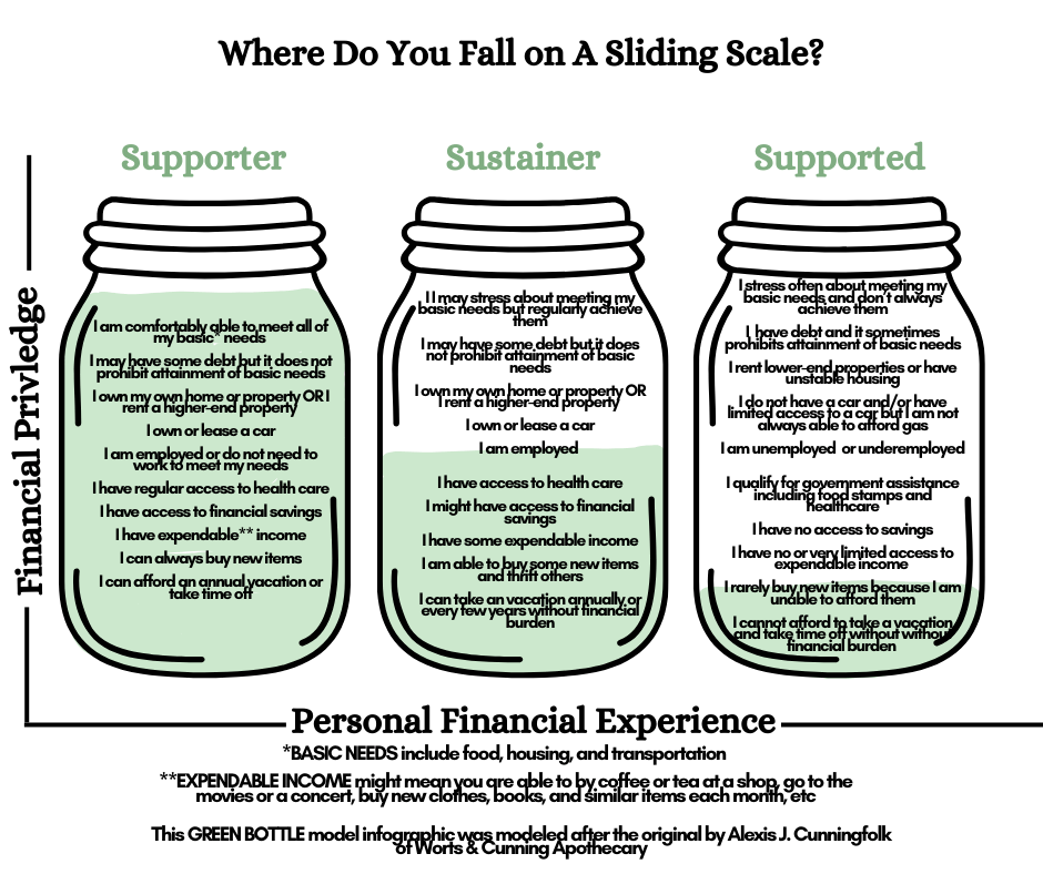 My sliding scale model is adapted from Alexis J. Cunningfolk’s Green Bottle analogy. It essentially asks individuals to self-identify where they fall in terms of their financial experience and access, and pay for services accordingly. This model ensures everyone in the community is able to access care.